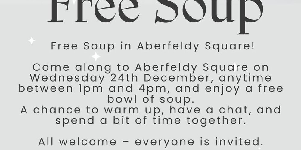 Wednesday 24th December, 1-4pm, we will be in The Square, Aberfeldy serving FREE tasty hot soup to anyone who wishes to come along.
